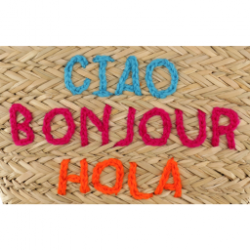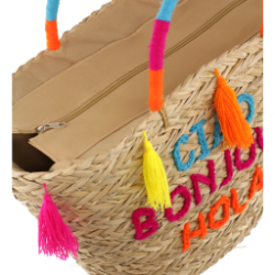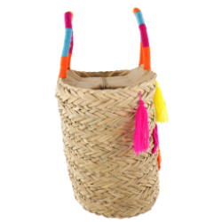 Colorata cesta mare in paglia naturale intrecciata a mano rifinita con nappine colorate e frange multicolor. Fodera interna in tinta, chiusura superiore in tessuto cotone con cerniera lampo. Adatta come borsa mare o elegante accessorio per le serate estive. Manici ricoperti in filo colorato. Dimensioni L 20 W 49 H 29